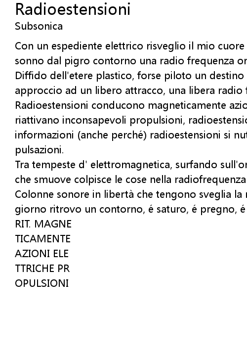 | Radioestensioni conducono magneticamente azioni, (forse perché) radioestensioni riattivano inconsapevoli propulsioni, radioestensioni contagiano con libere informazioni (anche perché) radioestensioni si nutrono con autentiche pulsazioni. | |