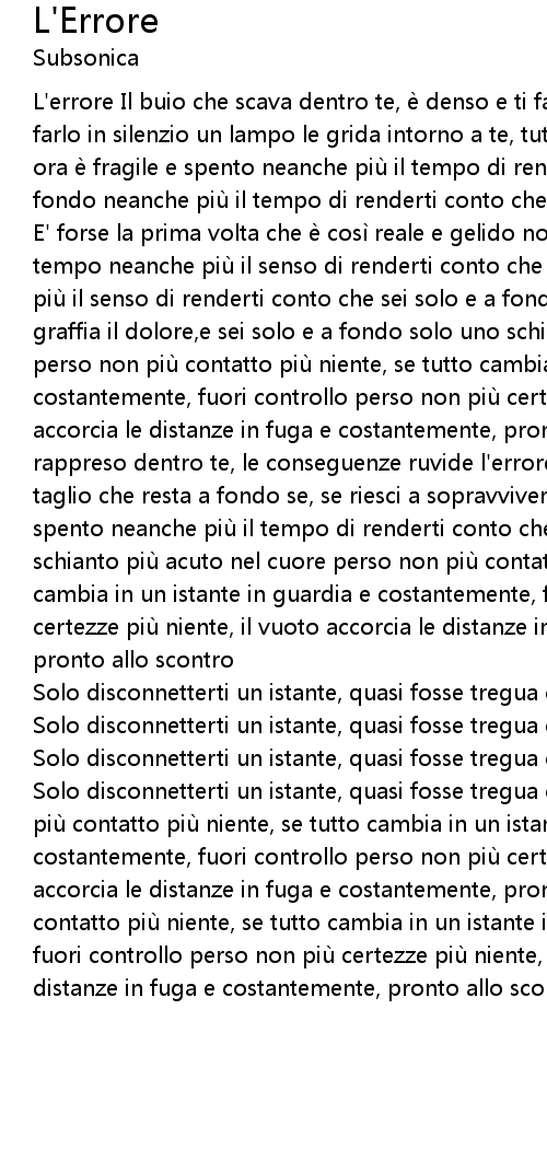 | L' errore Il buio che scava dentro te, e denso e ti fa piangere e tempo di farlo in silenzio un lampo le grida intorno a te, tutto sembrava facile e tutto ora e fragile e spento neanche piu il tempo di renderti conto che sei solo e a fondo neanche piu il tempo di renderti conto che sei solo e a fondo | |