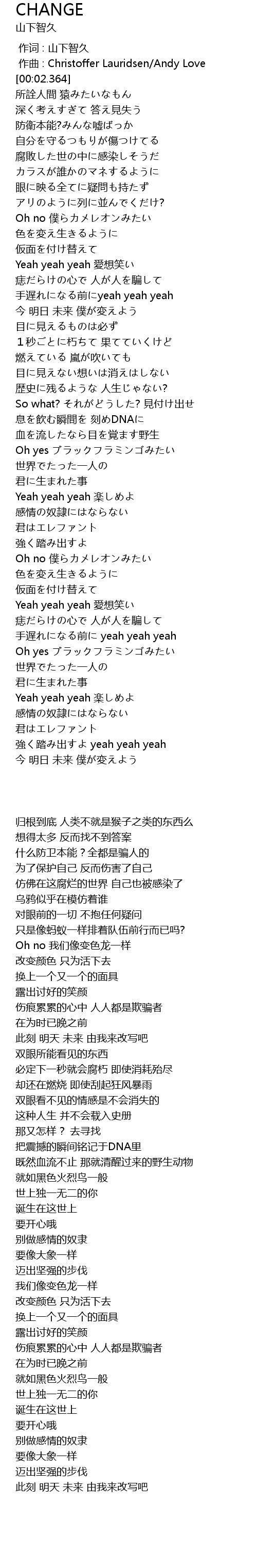| [02:30.217] | Oh no 僕らカメレオンみたい |
