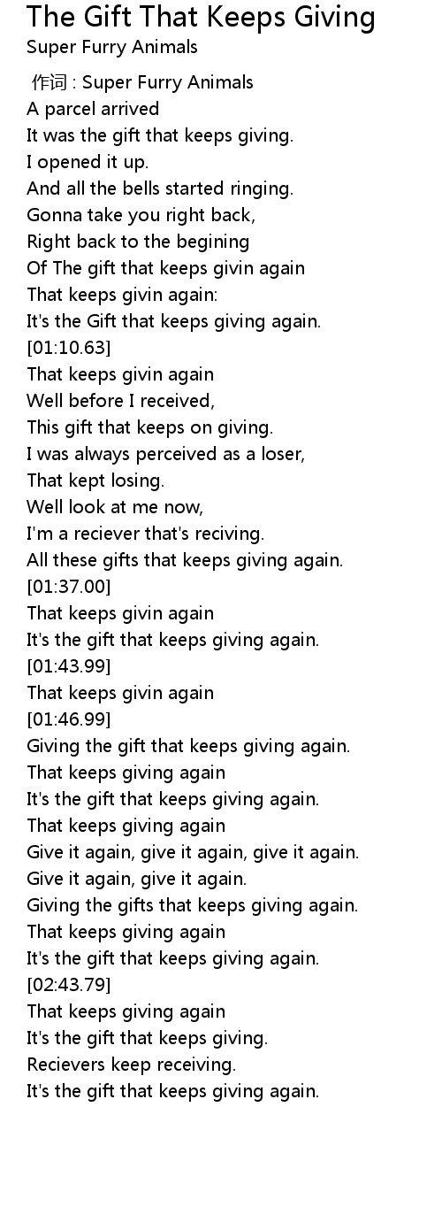 | [02:52.73] | It' s the gift that keeps giving again. |