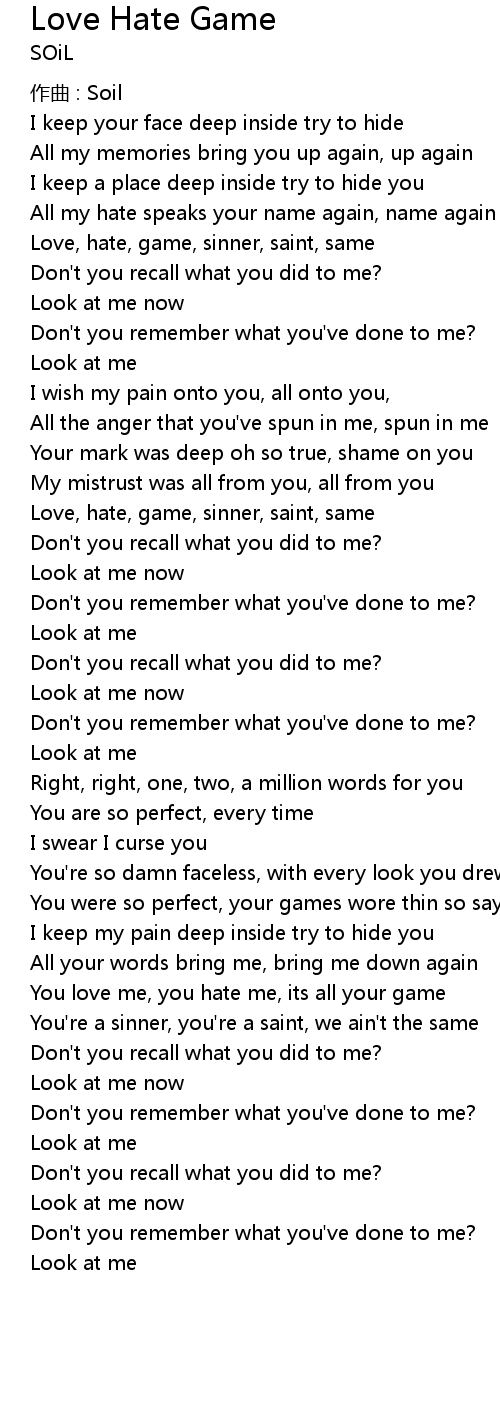 | Love, hate, game, sinner, saint, same | |