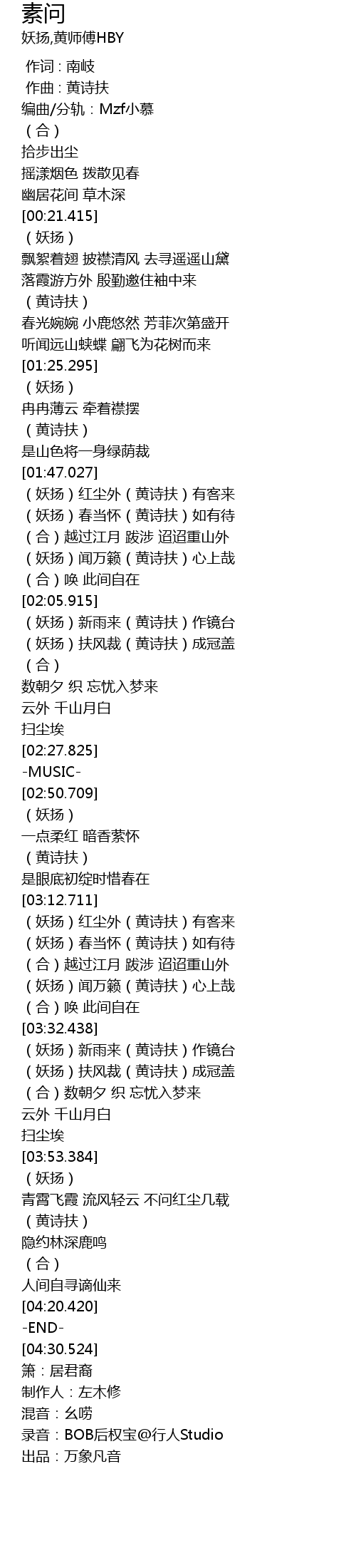 | [01:47.405] | (妖扬)红尘外(黄诗扶)有客来 |