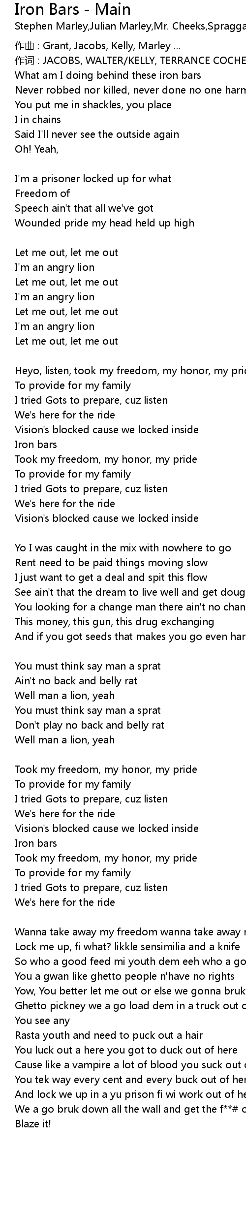 | 作词 : JACOBS, WALTER/KELLY, TERRANCE COCHEEKS/MARLEY, JULIAN/MARLEY, STEPHEN | |