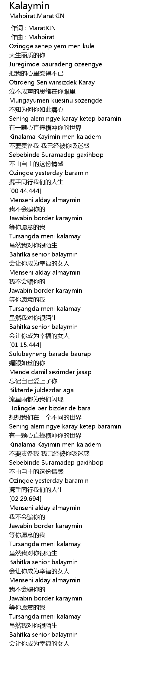 | [02:16.195] | Sening alemingye karay ketep baramin |