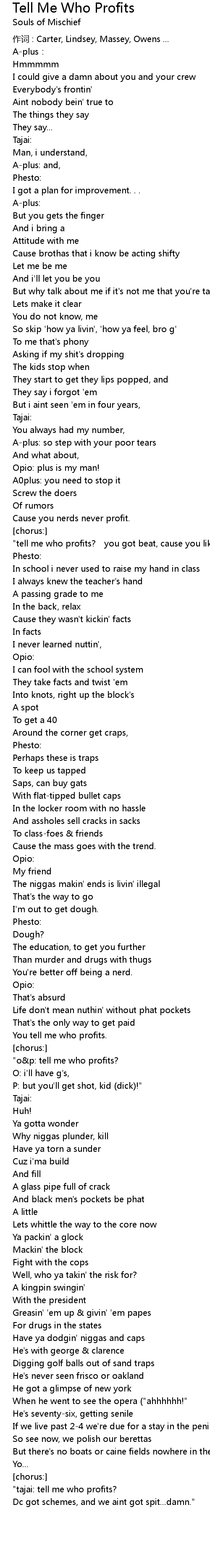 | "tell me who profits? you got beat, cause you like to gossip." | |