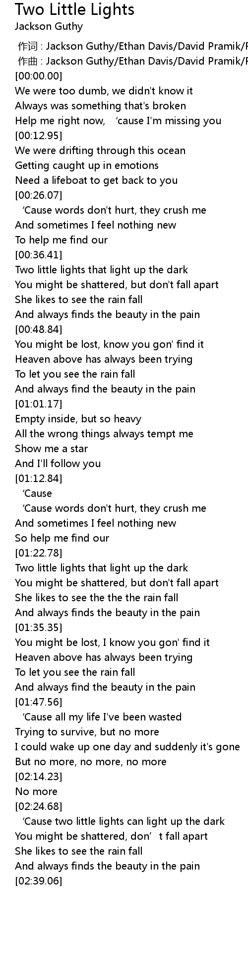 | [02:24.71] | ‘Cause two little lights can light up the dark |