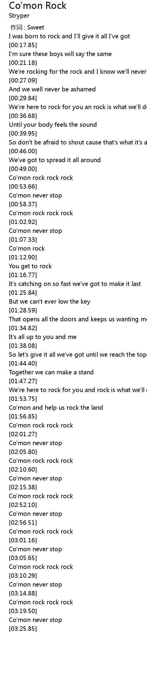 | [00:23.52] | We're rocking for the rock and I know we'll never stop |