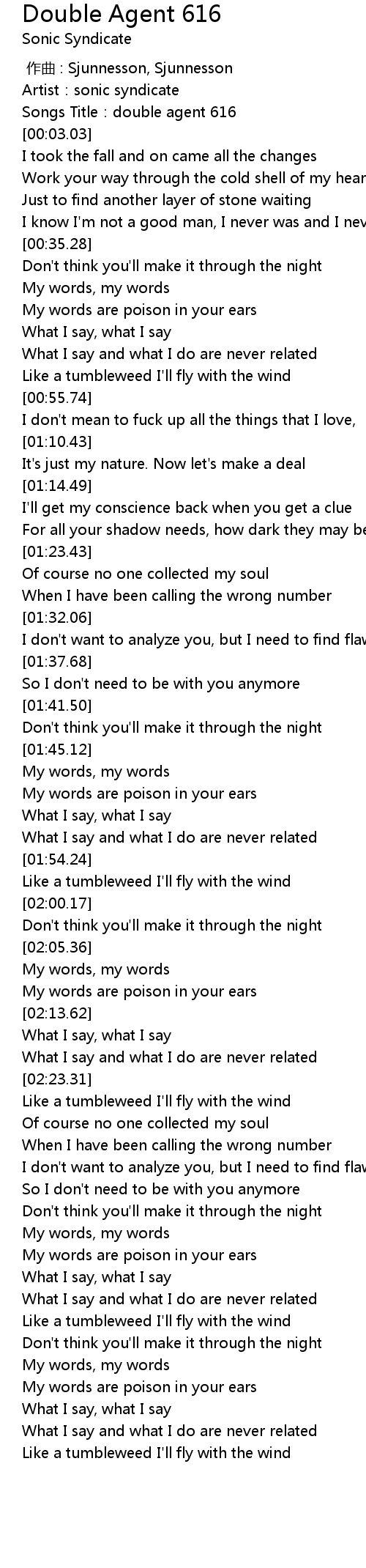 | [00:01.66] | Songs Title:double agent 616 |
