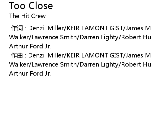 | [00:00.00-1] | 作曲 : Denzil Miller/KEIR LAMONT GIST/James Moore/Kurt Walker/Lawrence Smith/Darren Lighty/Robert Huggar/Raphael Shawan Brown/Robert Arthur Ford Jr. |
