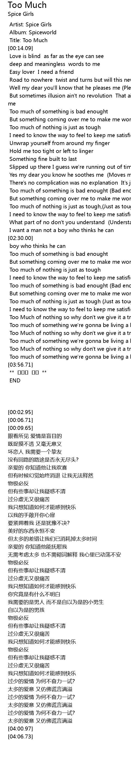 | [02:59.19] | Too much of something is bad enought Bad enough |
