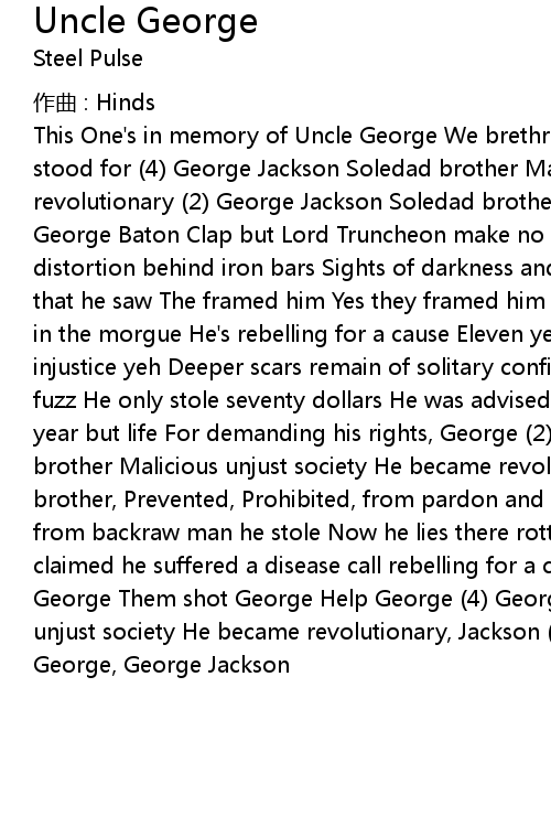 | This One' s in memory of Uncle George We brethrens aware, we realise what you stood for 4 George Jackson Soledad brother Malicious unjust society He became revolutionary 2 George Jackson Soledad brother No Three Cheers For Uncle George Baton Clap but Lord Truncheon make no applause Weathered face of distortion behind iron bars Sights of darkness and torture and condemned Fate that he saw The framed him Yes they framed him Backraw back up George Right now in the morgue He' s rebelling for a cause Eleven years he' s beared the scars of injustice yeh Deeper scars remain of solitary confinement No you can' t trust the fuzz He only stole seventy dollars He was advised to plead guilty He got not one year but life For demanding his rights, George 2 George Jackson Soledad brother Malicious unjust society He became revolutionary, George Jackson Soledad brother, Prevented, Prohibited, from pardon and parole Just a foolish youth, from backraw man he stole Now he lies there rotting in a morbid morgue The Fuzz claimed he suffered a disease call rebelling for a cause 4 O Lord them got George Them shot George Help George 4 George Jackson Soledad brother Malicious unjust society He became revolutionary, Jackson 2 Confinement confinement George, George Jackson |