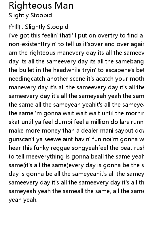 | i' ve got this feelin' thati' ll put on overtry to find a ______ ruleswe' re nonexistenttryin' to tell us it' sover and over againand its time for us to sayi am the righteous manevery day its all the sameevery day its all the sameevery day its all the sameevery day its all the samebang bang bang bang he saidhe took the bullet in the headwhile tryin' to escapehe' s better off he saidtryin' not needingcatch another scene it' s acatch your mother if you cani am your righteous manevery day it' s all the sameevery day it' s all the sameevery day it' s all the sameevery day it' s all the sameyeah yeah the sameall the same all the sameall the same all the sameyeah yeahit' s all the sameyeahit' s all the sameyeahit' s all the samei' m gonna wait wait wait until the morning comesi' m gonna skatskiddly skat until ya feel dumbi feel a million dollars runnin' through my handi' m gonna make more money than a dealer mani sayput down the badges and throw away your gunscan' t ya seewe aint havin' fun noi' m gonna wait til' the break of dawnto hear this funky reggae songyeahfeel the beat rushin' through my veinspeople try to tell meeverything is gonna beall the same yeahi sayevery day is gonna be the same it' s all the same every day is gonna be the same it' s all the same every day is gonna be all the sameyeahit' s all the sameyeahevery day it' s all the sameevery day it' s all the sameevery day it' s all the sameevery day it' s all the sameyeah yeah the sameall the same, all the same, all the sameall the same, yeah yeah yeah. |