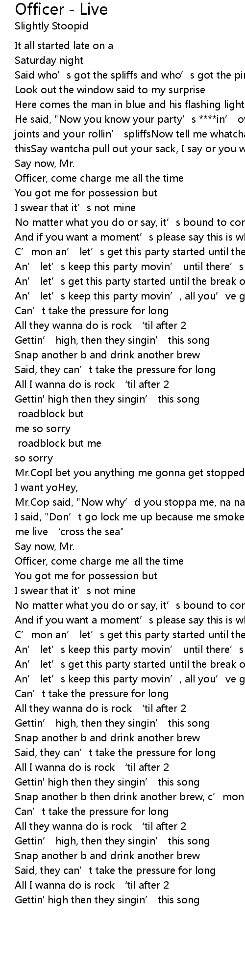 | He said, "Now you know your party’s ****in’ over withBecause ya smokin’ joints and your rollin’ spliffsNow tell me whatcha think I ought to think of thisSay wantcha pull out your sack, I say or you will be missed" | |
