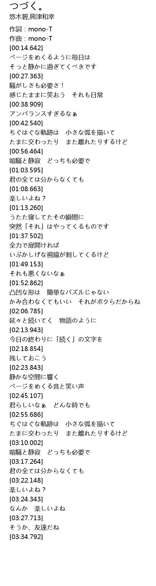 | [02:14.204] | 今日の終わりに「続く」の文字を |