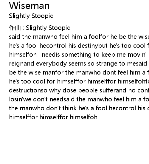 | said the manwho feel him a foolfor he be the wisemanfor the manwho don' t think he' s a fool hecontrol his destinybut he' s too cool for himselffor himselffor himselfoh i needis something to keep me movin' onin a worldwhere violence reignand everybody seems so strange to mesaid the manwho feel him a foolfor he be the wise manfor the manwho dont feel him a fool hecontrol his destinyyeah he' s too cool for himselffor himselffor himselfohto coolhis weapon of destructionso why dose people sufferand no confusionyou aint winnin' if your losin' we don' t needsaid the manwho feel him a fool hefor he be the wisemanfor the manwho don' t think he' s a fool hecontrol his destinybut he' s too cool for himselffor himselffor himselfoh |