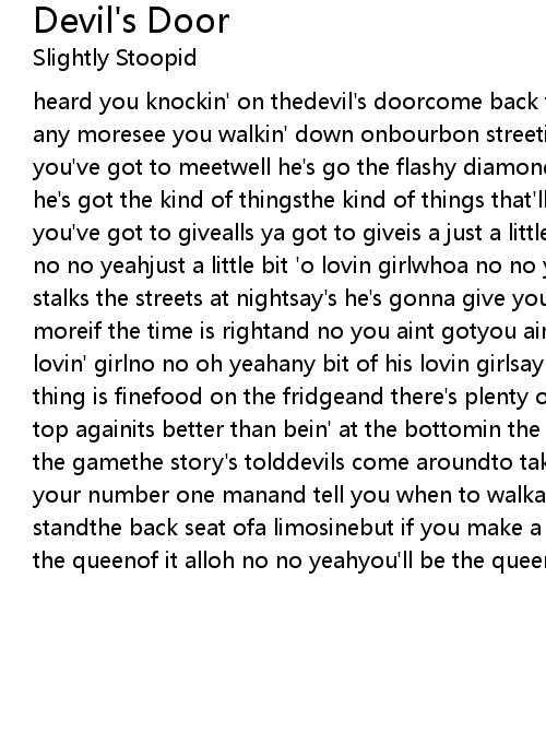 heard you knockin' on thedevil's doorcome back tommorow babycause he aint takin' any moresee you walkin' down onbourbon streeti can tell you girlwho the man is you've got to meetwell he's go the flashy diamondshe's got the brand new carsays he's got the kind of thingsthe kind of things that'll take you faran' alls you've got to givealls ya got to giveis a just a little bit 'o lovin' girlwhoa no no yeahjust a little bit 'o lovin girlwhoa no no yeahwell like a vampireshe stalks the streets at nightsay's he's gonna give you every thing you want and moreif the time is rightand no you aint gotyou aint gotto takebut any bit of his lovin' girlno no oh yeahany bit of his lovin girlsay money's comin' inbut every thing is finefood on the fridgeand there's plenty of timeto get you back up on top againits better than bein' at the bottomin the bitter endbut i got you in the gamethe story's tolddevils come aroundto take your soulsaid he wants to be your number one manand tell you when to walkand who to ****and when you can standthe back seat ofa limosinebut if you make a million dollarsbaby you'll be the queenof it alloh no no yeahyou'll be the queen of it allwhoa no no yeah |