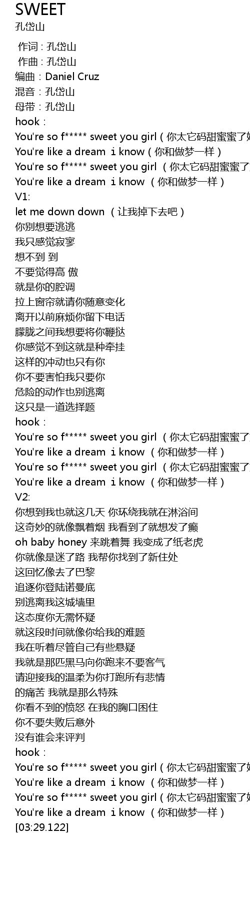 | [00:35.673] | You're so f***** sweet you girl(你太它码甜蜜蜜了姑娘) |