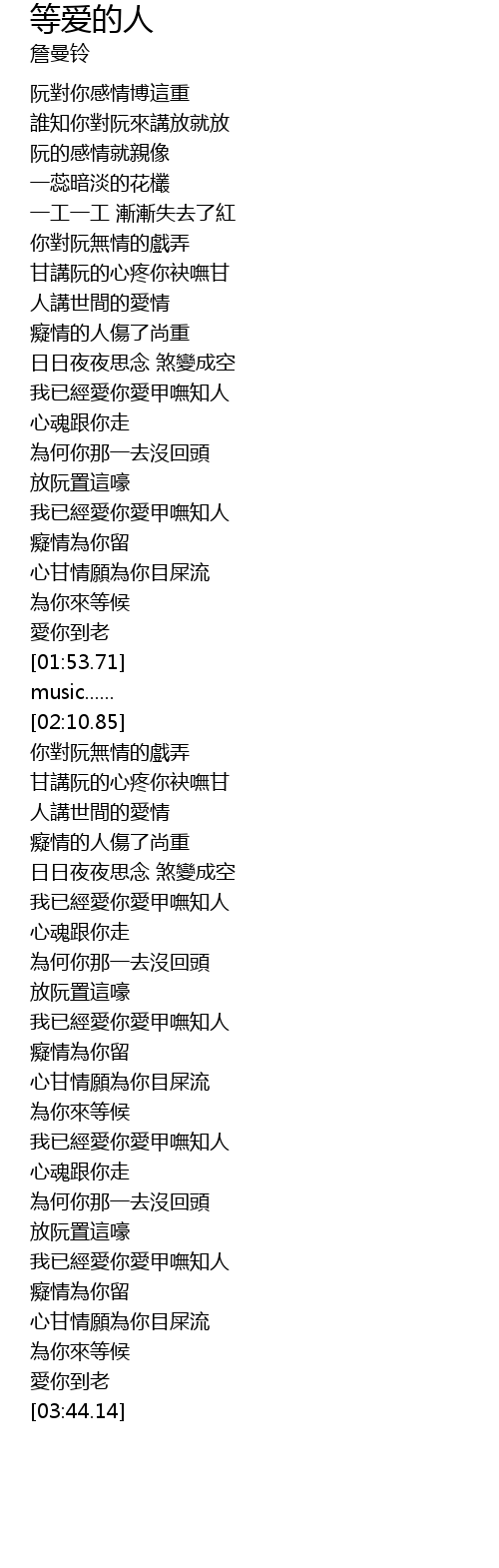 | [02:59.44] | 我已經愛你愛甲嘸知人 |