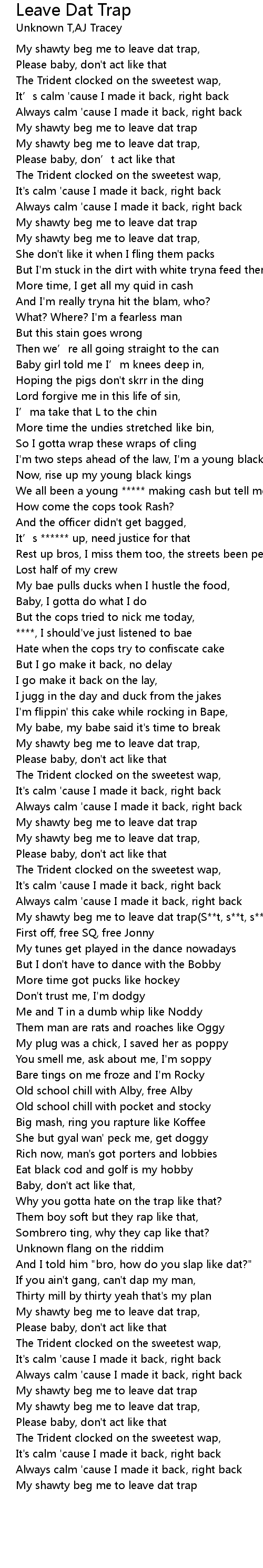 | [02:11.41] | My shawty beg me to leave dat trap(S**t, s**t, s**t, look) |