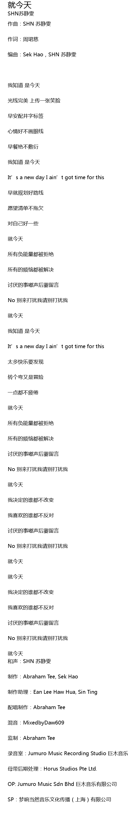 | 编曲:Sek Hao,SHN 苏静雯 | |