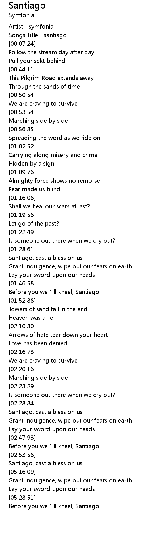 | [05:29.45] | Before you we ll kneel, Santiago |