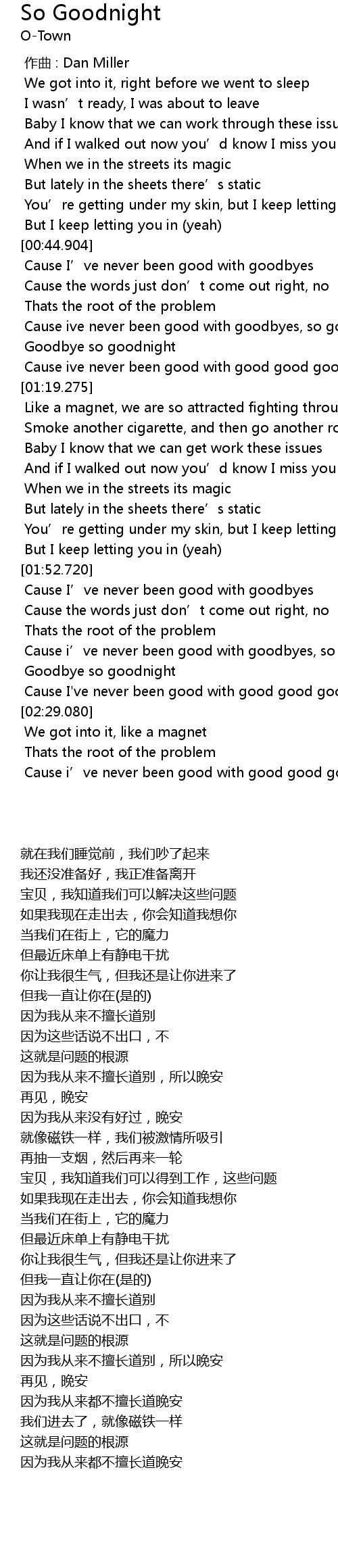 | [02:43.748] | Cause i’ve never been good with good good goodnight |