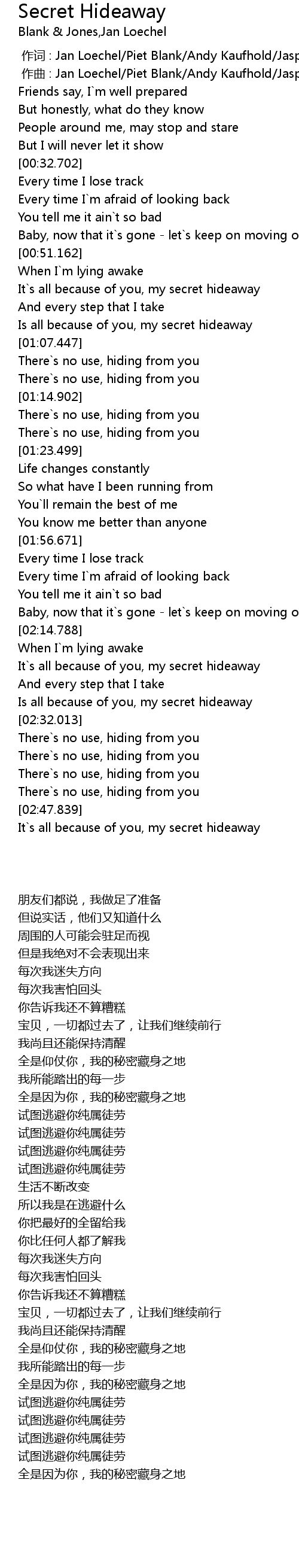 | [02:51.834] | It`s all because of you, my secret hideaway |