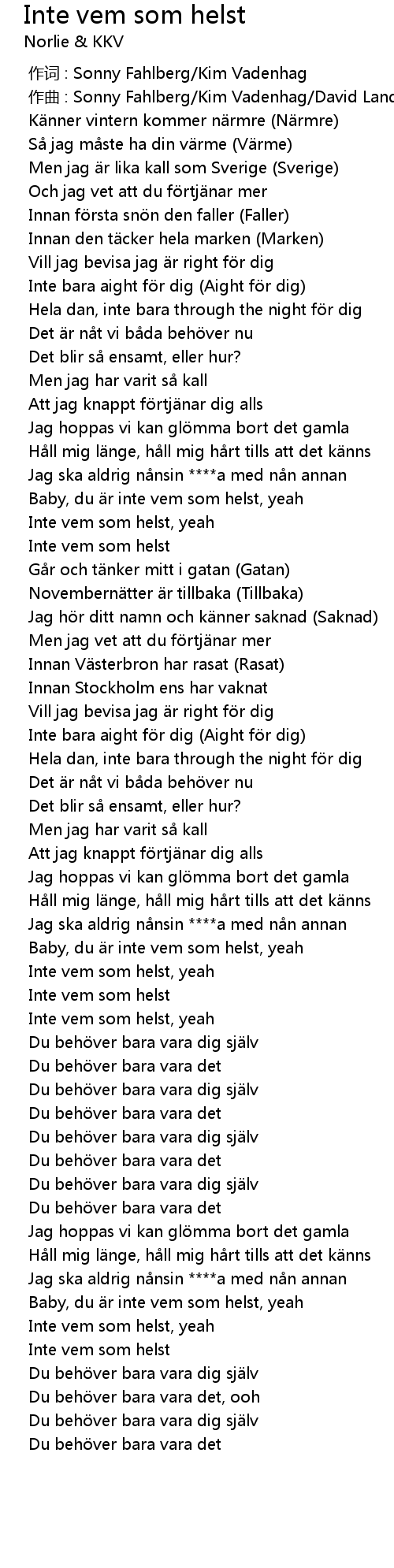 | [00:54.711] | Baby, du r inte vem som helst, yeah |