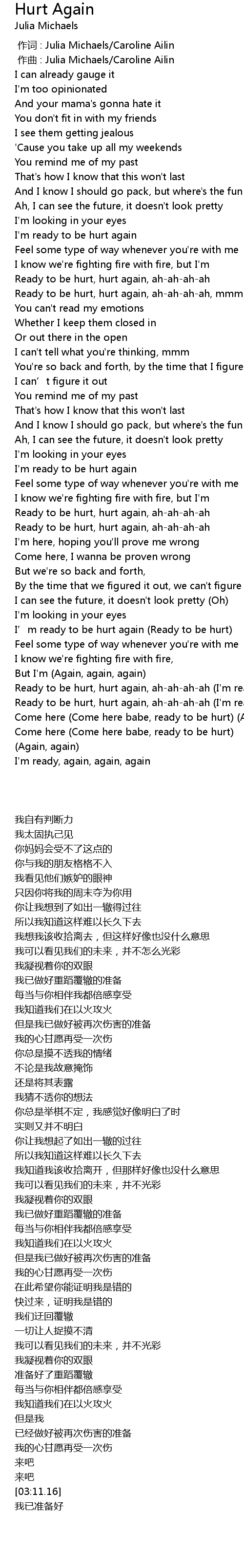 | [03:04.69] | Come here Come here babe, ready to be hurt |