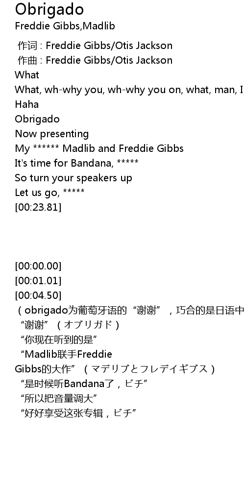 | [00:00.00] | 作词 : Freddie Gibbs/Otis Jackson |