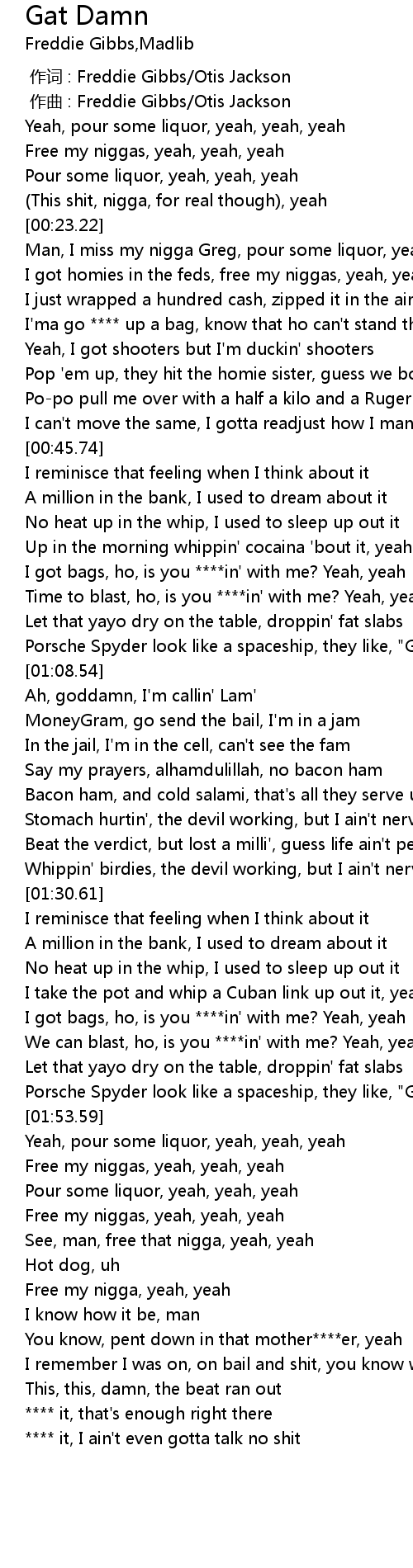 | [00:01.00] | 作曲 : Freddie Gibbs/Otis Jackson |