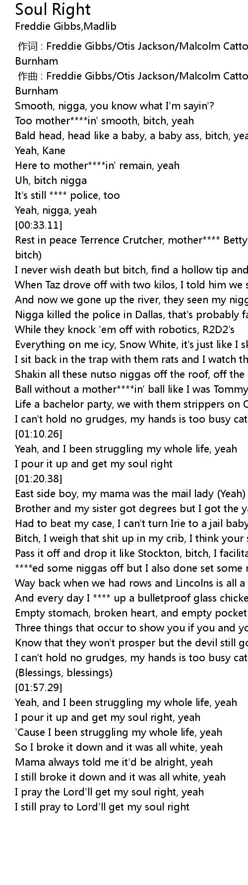 | [02:03.32] | I pour it up and get my soul right, yeah |