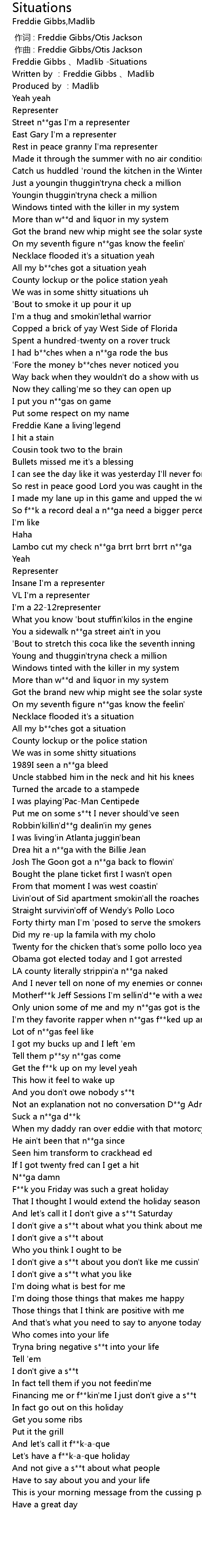 | [00:00.00] | Freddie Gibbs 、Madlib -Situations |