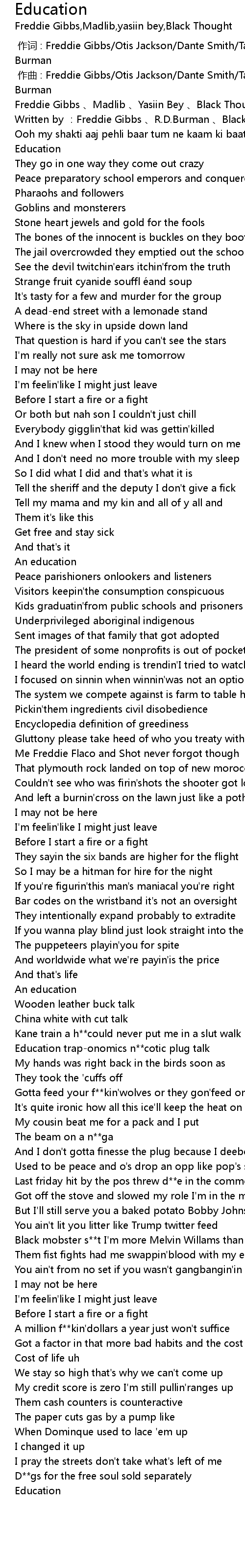 | [00:00.00] | Freddie Gibbs 、Madlib 、Yasiin Bey 、Black Thought -Education |