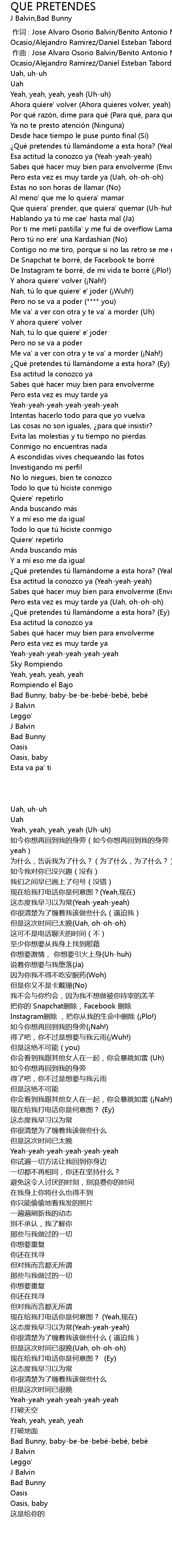 | [00:01.00] | zuo qu : Jose Alvaro Osorio Balvin Benito Antonio Martinez Ocasio Alejandro Ramirez Daniel Esteban Taborda Valencia |
