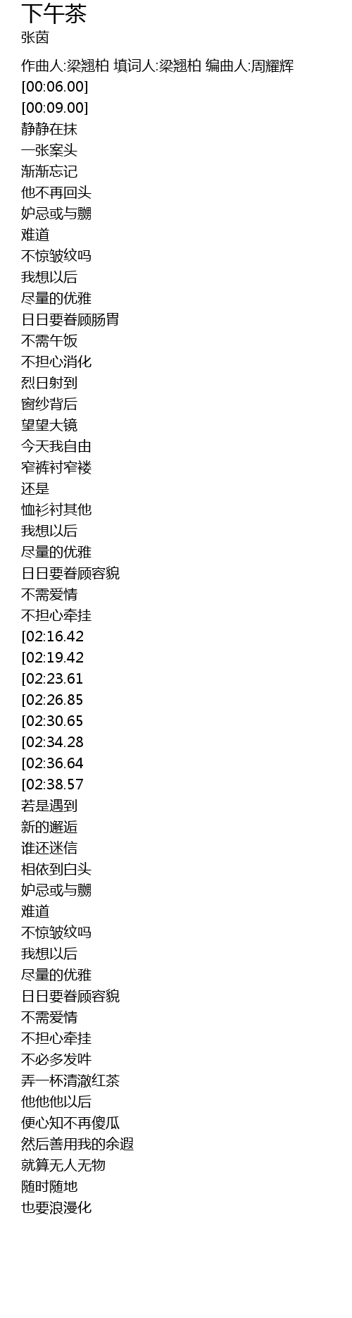 | [00:03.00] | 作曲人:梁翘柏 填词人:梁翘柏 编曲人:周耀辉 |