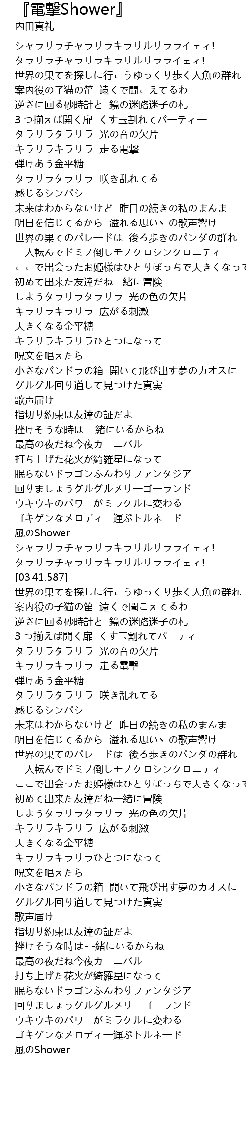 | [04:12.406] | キラリラキラリラ 走る電撃 |