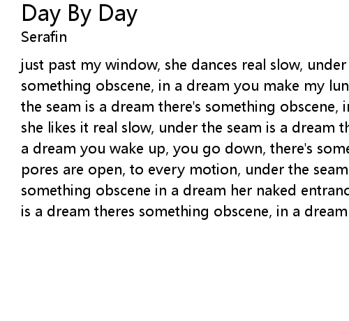 just past my window, she dances real slow, under the seam is a dream there's something obscene, in a dream you make my lungs sweat, my liquid skin set, under the seam is a dream there's something obscene, in a dream just like my rainbow, she likes it real slow, under the seam is a dream there's something obscene, in a dream you wake up, you go down, there's something in between, day by day my pores are open, to every motion, under the seam is a dream is a dream theres something obscene in a dream her naked entrance to naked violence under the seam is a dream theres something obscene, in a dream i've always wanted to be in you |