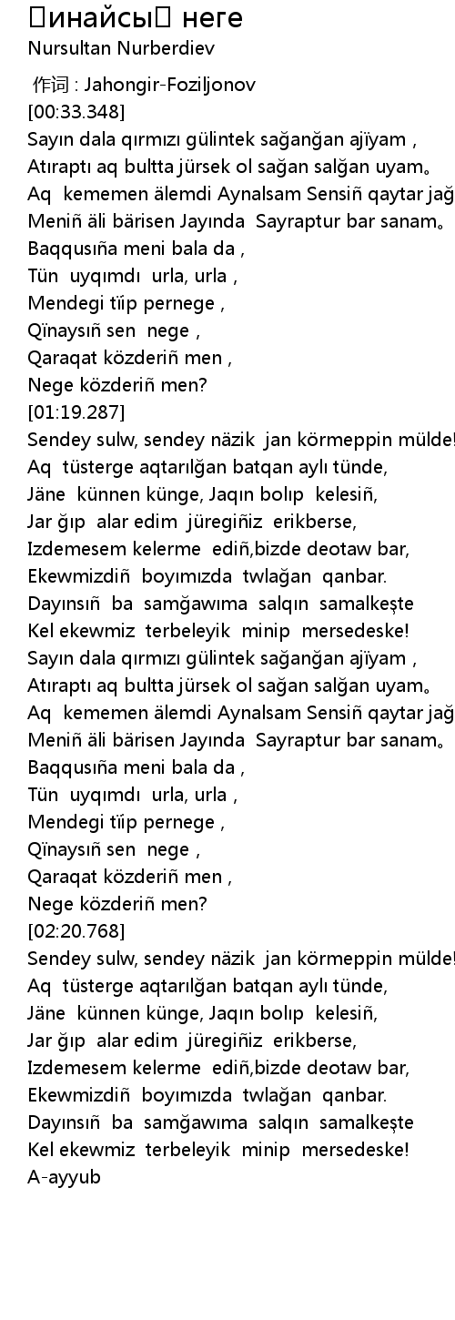 | [01:46.977] | Aq kememen älemdi Aynalsam Sensiñ qaytar jağam, |