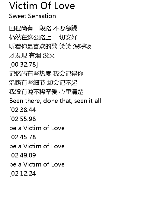 | [02:59.44][02:45.78][02:30.44][02:18.09][02:04.39][01:50.72][01:37.14][01:19.89][01:06.21] | Don' t be a Victim of Love |