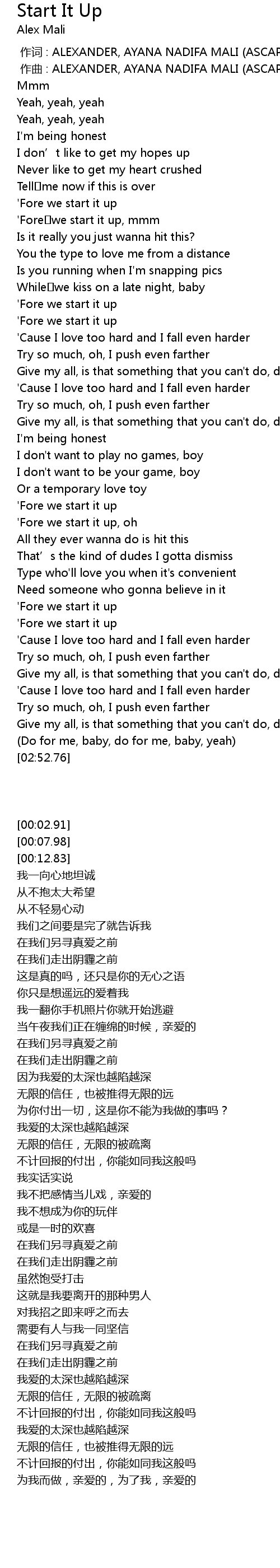 | [00:01.00] | zuo qu : ALEXANDER, AYANA NADIFA MALI ASCAP |