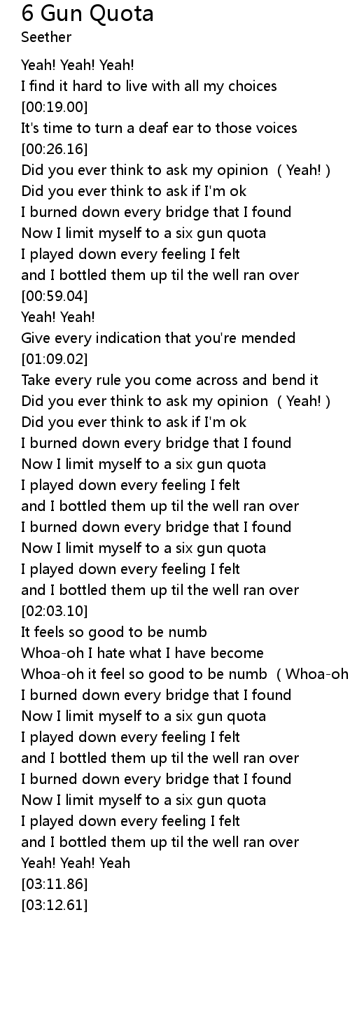 | [00:46.94] | Now I limit myself to a six gun quota |