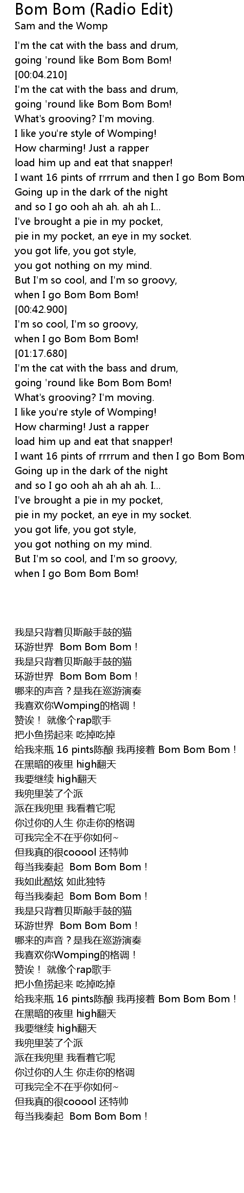 | [00:13.418] | going ' round like Bom Bom Bom! |