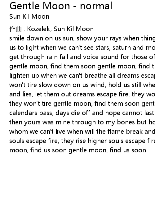 | smile down on us sun, show your rays when things come undone all animals lead, us to light when we can' t see stars, saturn and moon, glow for those who cannot get through rain fall and voice sound for those of whom still are not found gentle moon, find them soon gentle moon, find them black sky and black sea, lighten up when we can' t breathe all dreams escape fire, over worlds fly but won' t tire slow down on us wind, hold us still when everything spins all secrets and lies, let them out dreams escape fire, they won' t tire dreams escape fire, they won' t tire gentle moon, find them soon gentle moon, find them soon all calendars pass, days die off and hope cannot last but if love was like stone, then yours was mine through to my bones but how can we give back to those with whom we can' t live when will the flame break and spare the good people it takes souls escape fire, they rise higher souls escape fire, they rise higher gentle moon, find us soon gentle moon, find us soon |