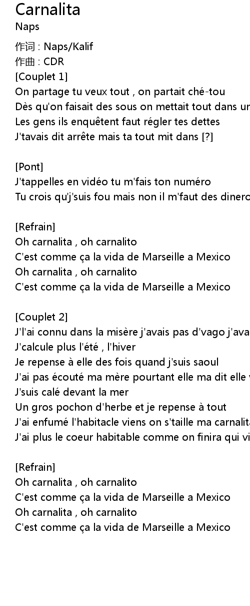 | J' ai enfumé l' habitacle viens on s' taille ma carnalita | |