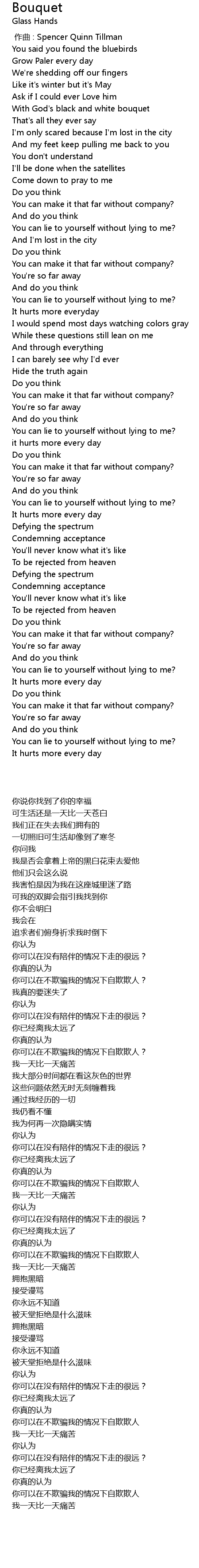 | [00:27.50] | With God' s black and white bouquet |