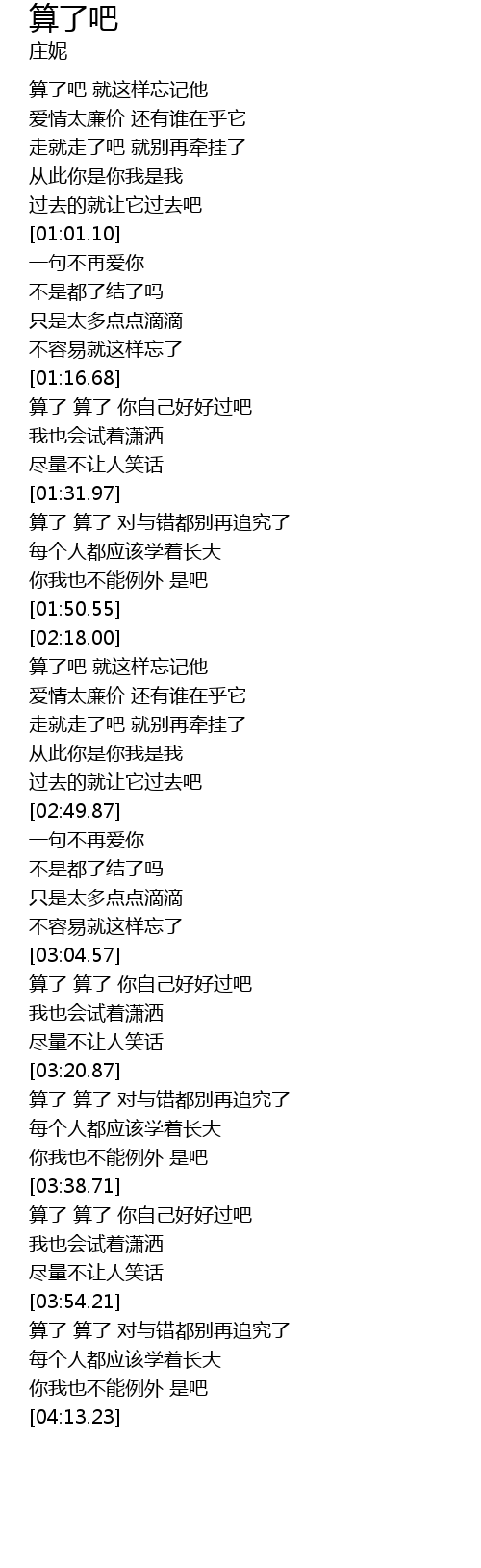 | [03:06.93] | suàn le suàn le nǐ zì jǐ hǎo hǎo guò ba |