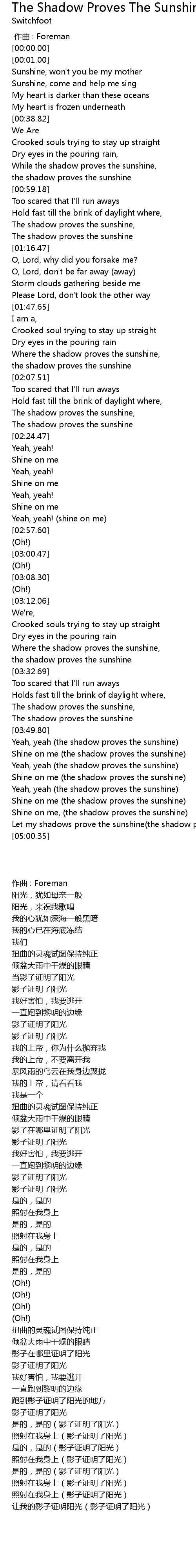 | [04:20.38] | Let my shadows prove the sunshine the shadow proves the sunshine |