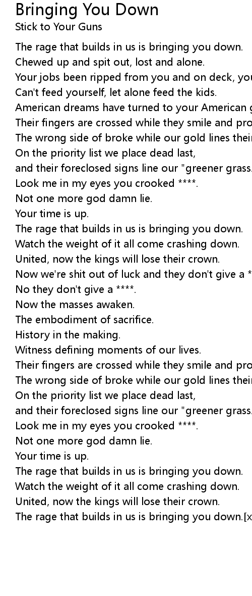 The rage that builds in us is bringing you down.[x4] |