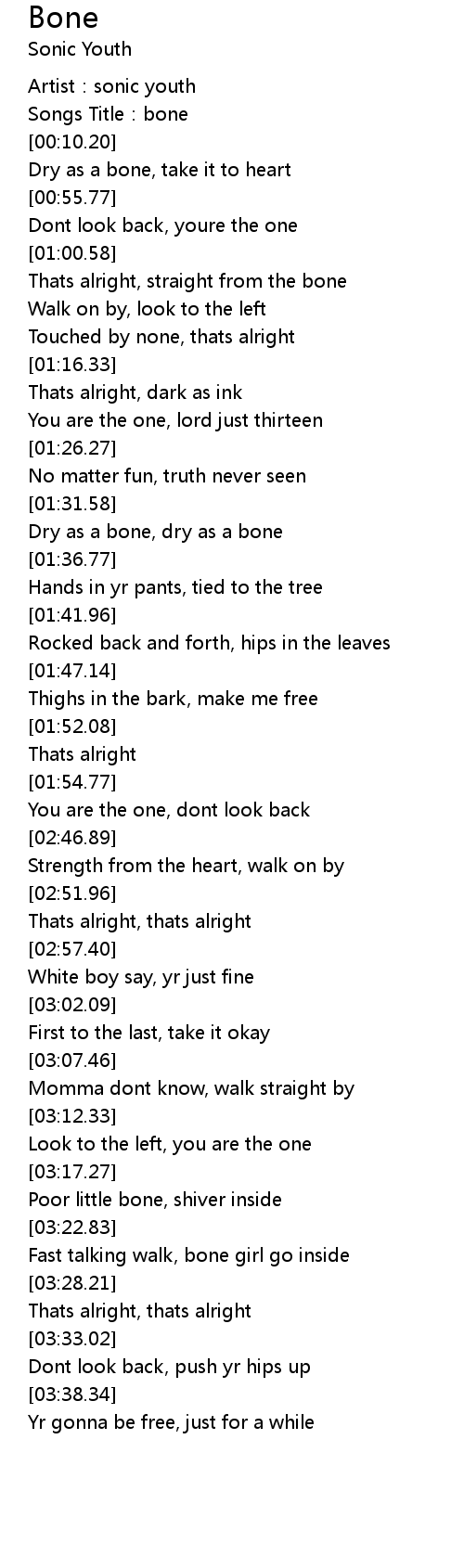 | [01:32.58] | Dry as a bone, dry as a bone |